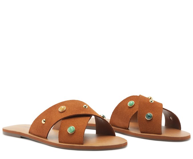 Rasteira de tiras cruzadas, em couro acamurçado, na cor marrom. O modelo possui solado emborrachado marrom, com leve saltinho traseiro. Apresenta cabedal em duas tiras de couro acamurçado mais largas, com detalhe para aplicação de pins redondos com pedrarias e outros menores metálicos, espalhados por toda a peça. As tiras se cruzam em X sobre os dedos e o peito de pé. Com biqueira arredondada, traz palmilha com assinatura Anacapri. Aberta, deixa os dedos e o calcanhar totalmente à mostra.