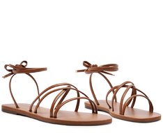 Rasteira de amarração e multitiras, na cor marrom. Com cabedal de material similar ao couro, o modelo traz quarteto de tirinhas finas - com design imponente: uma sobre os dedos, duas que se cruzam no centro e finaliza com outra na horizontal. Traz duas tirinhas finas, presas na lateral da parte traseira, fechando em amarração superior no tornozelo, com ponteiras metálicas. Apresenta solado rasteiro emborrachado com leve saltinho traseiro e palmilha acolchoada, com assinatura Anacapri. Deixa os dedos, laterais e calcanhar à mostra.