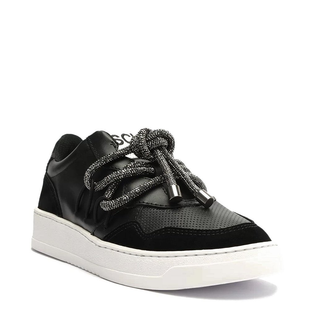 Esse glam sneaker é um verdadeiro ícone fashion, com seu cabedal em mix de couros lisos e acamurçados. O detalhe de amarração em cordão de cristal, finalizado com ponteira de metal, confere um toque de elegância única. Além disso, o solado em borracha proporciona conforto e estilo em cada passo.